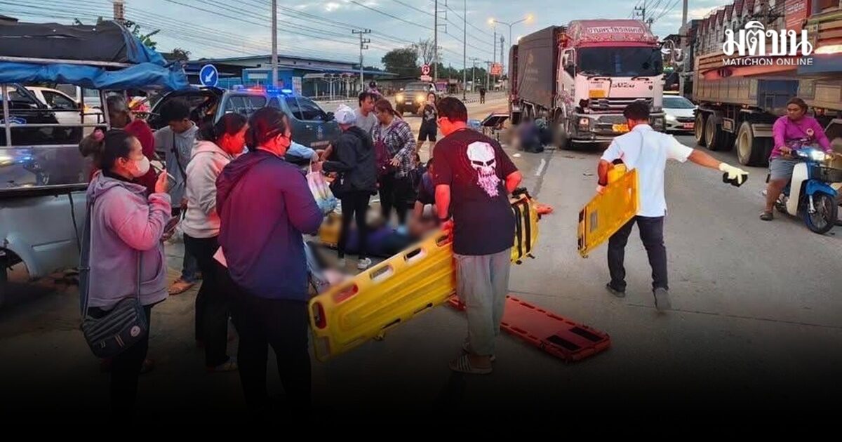 ชนสนั่น รถพ่วง18ล้อเบรกแตก เสยท้ายกระบะคนงานเจ็บ 16 ราย กู้ภัยเร่งช่วยผู้บาดเจ็บส่งรพ.