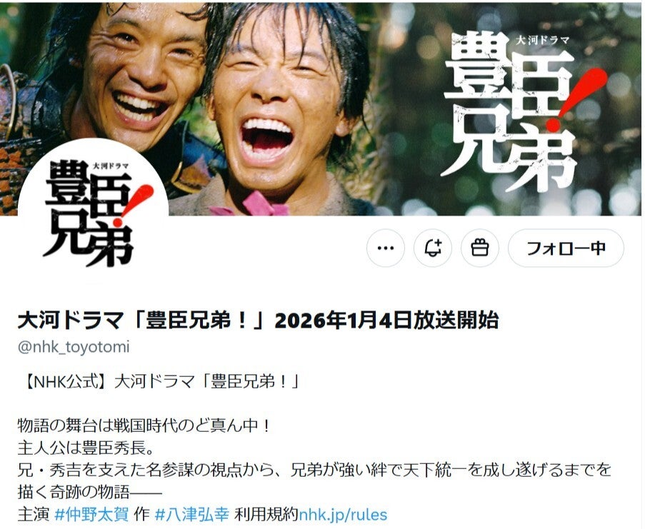 2026年1月スタートのNHK大河ドラマ『豊臣兄弟!』公式が12月14日、Xを更新。仲野太賀さん演じる主人公・豊臣秀長ら17名を掲載した相関図第一弾を公開しました。 大河ドラマ第65作目となる 本作 の主人公は天下人・豊臣秀吉の弟・豊臣秀長(仲野さん)。天下一の補佐役・秀長の目線で戦国時代をダイナミックに描く波乱万丈のエンターテインメントだといいます。 第一弾の相関図には、秀長(登場時の名は小一郎)を取り巻く人々がズラリ。 主人公・小一郎の家族や親しい人々には、3歳年上の兄でのちに豊臣秀吉となる藤吉郎(池松壮亮さん)、母・なか(坂井真紀さん)、姉・とも(宮澤エマさん)、妹・あさひ(倉沢杏菜さん)。 小一郎の幼なじみで初恋の人となる直(白石聖さん)、小一郎の正妻・慶(吉岡里帆さん)、藤吉郎の正妻・寧々(浜辺美波さん)。 豊臣兄弟を取り巻く戦国武将として、豊臣兄弟の絶対的な主君となる織田信長(小栗旬さん)、信長亡きあと兄弟の最強のライバルとなる徳川家康(松下洸平さん)。 秀吉の生涯の友でライバルとなる前田利家(大東駿介さん)、信長の重臣・柴田勝家(山口馬木也さん)、 信長に反旗を翻す浅井長政(中島歩さん)、主君の信長を討つ明智光秀(要潤さん)、信長に徹底抗戦した斎藤龍興(濱田龍臣さん)。 乱世に翻弄される信長の妹・市(宮﨑あおいさん)、利家の正妻・まつ(菅井友香さん)が掲載されています。 豪華キャストが並ぶ相関図には「小栗旬さんの織田信長といえば、『信長協奏曲』を思い出しますが、今回の信長は威風堂々な信長ですね」「あおいちゃん演じるお市様楽しみです」「戦国ど真ん中の人間関係が一気に見えてワクワクする…」など期待の声が寄せられています。 NHK大河ドラマ『豊臣兄弟!』は、2025年1月4日よる8時から放送開始となります。 【画像】 『豊臣兄弟!』の相関図第一弾 【あわせて読みたい】 NHKドラマ「ひらやすみ」登場の猫2匹は原作者・真造圭伍の愛猫だった!第2話と第10話に出演 Related... 【画像】仲野太賀主演、NHK新大河ドラマ「豊臣兄弟!」相関図第一弾。織田信長役に小栗旬など俳優陣17人発表 アンガ田中、二級建築士合格を祝う“製図ケーキ”が「斬新すぎる」と話題⇨本人制作の図面をプリント 「M-1」ガシャポンが今年も登場。歴代王者名前入り“優勝トロフィー”に「爆かわすぎて即回したくなる」 ...クリックして全文を読む