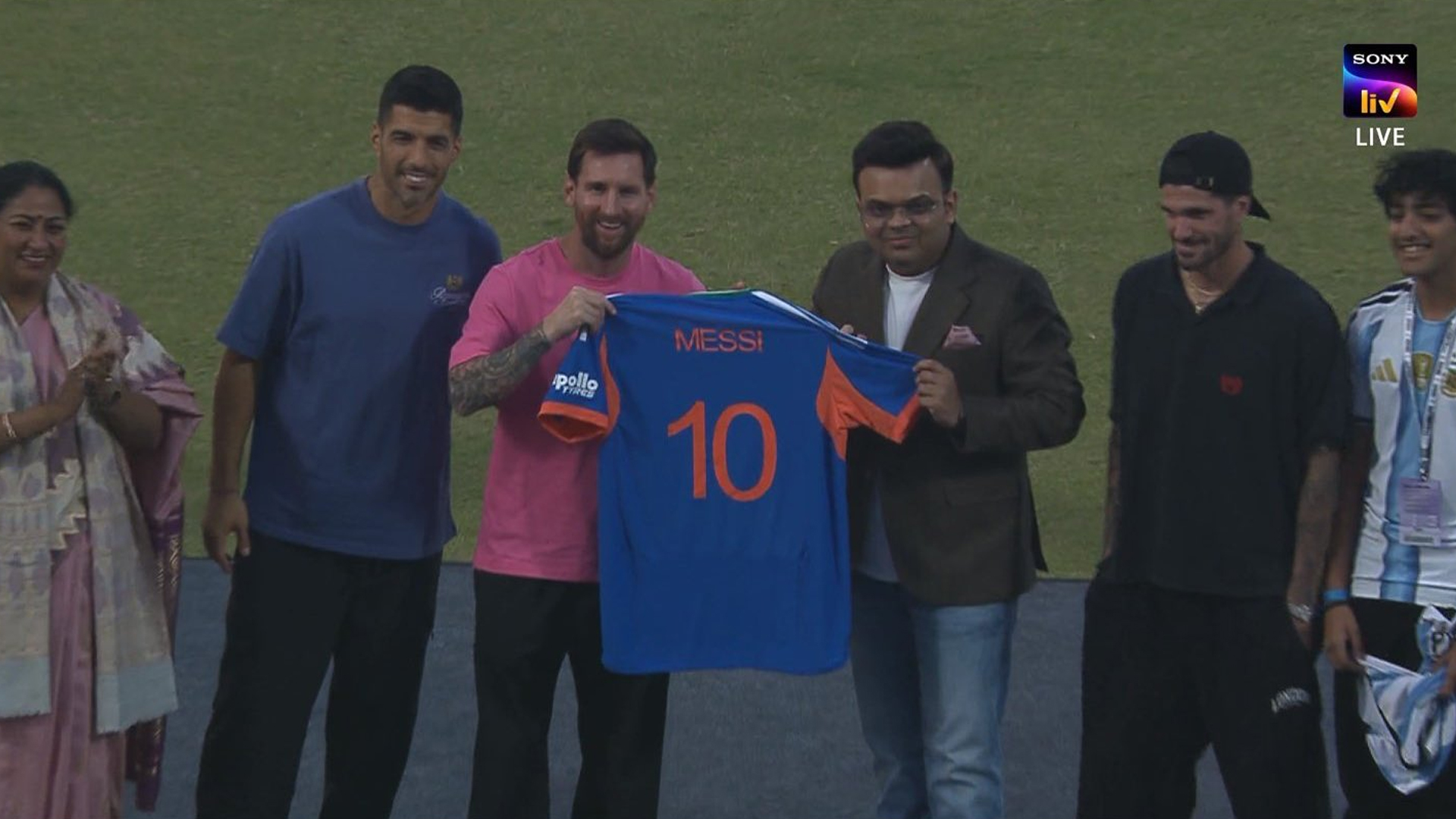 'গোট ইন্ডিয়া ট্যুর'–এর তৃতীয় দিনে ও শেষ দিনে লিওনেল মেসি দিল্লিতে অবস্থান করছিলেন। দুপুরে দিল্লিতে পৌঁছে আর্জেন্টাইন মহাতারকা তার সঙ্গী লুইস সুয়ারেজ ও রদ্রিগো ডি পলকে নিয়ে অরুণ জেটলি স্টেডিয়ামে উপস্থিত হন।মেসি যখন অরুণ জেটলি স্টেডিয়ামে উপস্থিত হন, তখন সেখানে 'সেলিব্রিটি মেসি অল স্টারস' ও 'মিনার্ভা মেসি অল স্টারস' দলের মধ্যে একটি প্রদর্শনী ম্যাচ চলছিল। এই ম্যাচে মিনার্ভা মেসি অল স্টারস দলটি ৬-০ ব্যবধানে সেলিব্রিটি মেসি অল স্টারসকে পরাজিত করে।মেসি ও তার দুই সতীর্থের দিল্লি সফর উপলক্ষে অরুণ জেটলি স্টেডিয়ামে বিশেষ এক অনুষ্ঠানের আয়োজন করা হয়। সেই অনুষ্ঠানে এই আর্জেন্টাইন কিংবদন্তি, তার দুই সতীর্থ সুয়ারেজ ও ডি পলকে ভারতের টি-টোয়েন্টি বিশ্বকাপের জার্সি উপহার হিসেবে দেন আইসিসি চেয়ারম্যান জয় শাহ।বিসিসিআইয়ের সাবেক সভাপতি জয় শাহ ওই অনুষ্ঠানে উপস্থিত উচ্চপর্যায়ের অতিথিদের একজন ছিলেন। তার সঙ্গে উপস্থিত ছিলেন দিল্লির মুখ্যমন্ত্রী রেখা গুপ্তা ও ভারতের ফুটবল কিংবদন্তি বাইচুং ভুটিয়া। আরও পড়ুন: নয়া দিগন্তকে হারিয়ে সময় টিভির শুভসূচনাজয় শাহ মেসির হাতে ভারতের জার্সি তুলে দেন, যেখানে ফুটবলারের নাম ও জার্সি নম্বর লেখা ছিল। পাশাপাশি আইসিসি চেয়ারম্যান আসন্ন টি-টোয়েন্টি বিশ্বকাপের ভারত বনাম যুক্তরাষ্ট্র ম্যাচের একটি টিকিটও মেসিকে উপহার দেন।মুম্বাই থেকে আজ (১৫ ডিসেম্বর) সকালেই দিল্লিতে পৌঁছানোর কথা ছিল মেসির। দিল্লিতে কয়েকটি ইভেন্টে অংশগ্রহণ করে বিকেলে প্রস্থানের সময়সূচি নির্ধারিত ছিল। কিন্তু দিল্লির প্রতিকূল আবহাওয়ার জন্য মেসির ফ্লাইটের বিলম্ব হয়। সকালজুড়ে ঘন কুয়াশার কারণে বিমান উড়েনি। তাছাড়া গত কয়েকদিন ধরে দিল্লির বায়ুমান ‘তীব্রতর’। আজ সেটা ‘বিপজ্জনকে’ বদলেছে। তাই দিল্লিতে মেসির পৌঁছা বিলম্বিত হয়েছে।শেষ পর্যন্ত দুপুর আড়াইটা নাগাদ দিল্লি ইন্ধিরা গান্ধী বিমানবন্দরে অবতরণ করেন মেসি। সেখান থেকে যান অরুণ জেটলি স্টেডিয়ামে। ভারতের প্রধানমন্ত্রী নরেন্দ্র মোদির সঙ্গে দেখা করার কথা এই আর্জেন্টাইন মহাতারকার।