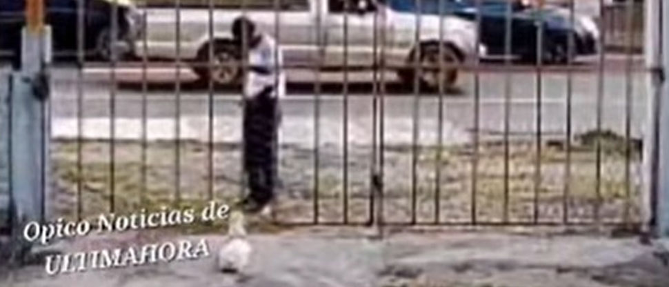 En el video se muestra cómo el sujeto se acerca a la puerta principal y comienza a interactuar con el perrito.