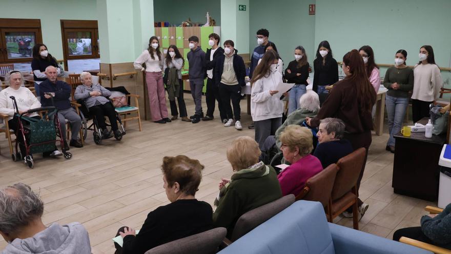 Si hay algo que evoca la Navidad es ese sentimiento de unión, de familiaridad, de juntarse para celebrar unas fechas festivas con los seres queridos. Pero también de recuerdo y agradecimiento con los que ya no están o incluso de compañía para aquellos que no pueden disfrutar de unas celebraciones conjuntas. Una mezcla de todas estas emociones fue lo que llevó al alumnado del IES Álvaro Cunqueiro, en Coia, a rendir un homenaje y amenizar las fiestas a los usuarios del centro de día Agarimo, ubicado en el mismo barrio.