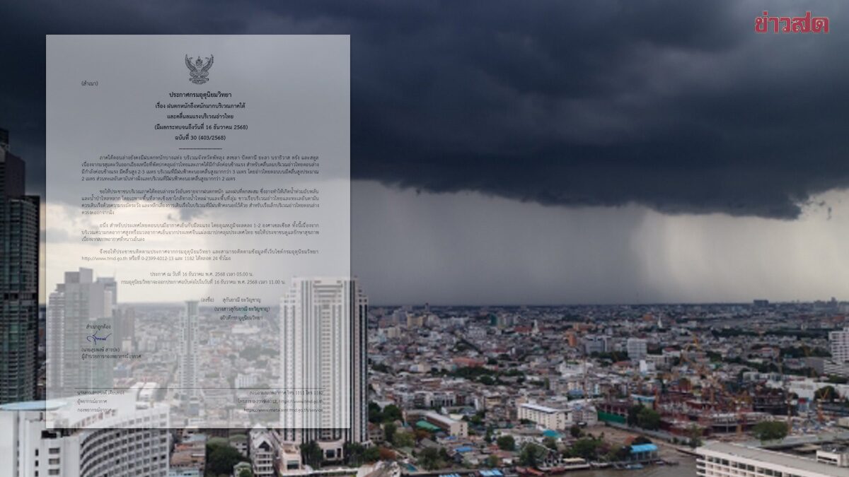 กรมอุตุนิยมวิทยา ประกาศฉบับที่ 30 เตือน ฝนตกหนักถึงหนักมาก คลื่นลมแรง เปิดชื่อจังหวัดที่ได้รับผลกระทบ น้ำท่วมฉับพลัน ไทยตอนบน อุณหภูมิลดลงอีก ลมแรง วันที่ 16 ธ.ค.2568 กรมอุตุนิยมวิทยา ประกาศ เรื่อง ฝนตกหนักถึงหนักมากบริเวณภาคใต้ และคลื่นลมแรงบริเวณอ่าวไทย (มีผลกระทบจนถึงวันที่ 16 ธันวาคม 2568) ฉบับที่ 30 (403/2568) ระบุว่า ภาคใต้ตอนล่างยังคงมีฝนตกหนักบางแห่ง บริเวณจังหวัดพัทลุง สงขลา ปัตตานี ยะลา นราธิวาส ตรัง และสตูล เนื่องจากมรสุมตะวันออกเฉียงเหนือที่พัดปกคลุมอ่าวไทยและภาคใต้มีกำลังค่อนข้างแรง สำหรับคลื่นลมบริเวณอ่าวไทยตอนล่างมีกำลังค่อนข้างแรง มีคลื่นสูง 2-3 เมตร บริเวณที่มีฝนฟ้าคะนองคลื่นสูงมากกว่า 3 เมตร โดยอ่าวไทยตอนบนมีคลื่นสูงประมาณ 2 เมตร ส่วนทะเลอันดามันห่างฝั่งและบริเวณที่มีฝนฟ้าคะนองคลื่นสูงมากกว่า 2 เมตร ขอให้ประชาชนบริเวณภาคใต้ตอนล่างระวังอันตรายจากฝนตกหนัก และฝนที่ตกสะสม ซึ่งอาจทำให้เกิดน้ำท่วมฉับพลันและน้ำป่าไหลหลาก โดยเฉพาะพื้นที่ลาดเชิงเขาใกล้ทางน้ำไหลผ่านและพื้นที่ลุ่ม ชาวเรือบริเวณอ่าวไทยและทะเลอันดามันควรเดินเรือด้วยความระมัดระวัง และหลีกเลี่ยงการเดินเรือในบริเวณที่มีฝนฟ้าคะนองไว้ด้วย […]