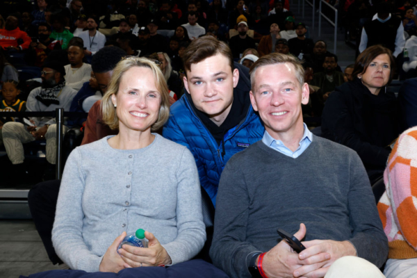 2022年3月29日在伊利诺州芝加哥温特拉斯特球馆举行的第45届麦当劳全美高中明星赛上,可以看到(从左到右)Heather Kempczinski、Chris Kempczinski和他们的儿子在场边观战。(Photo by Jeff Schear/Getty Images for McDonald's)