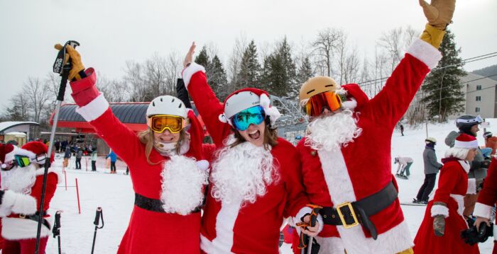 上周日(12月14日),美国逾300名滑雪爱好者身着圣诞装,齐聚缅因州西部小镇纽里(Newry)的周日河滑雪场(Sunday River Resort),参加这里举办的年度“圣诞老人星期天”活动,提前散播圣诞节的欢乐气氛。