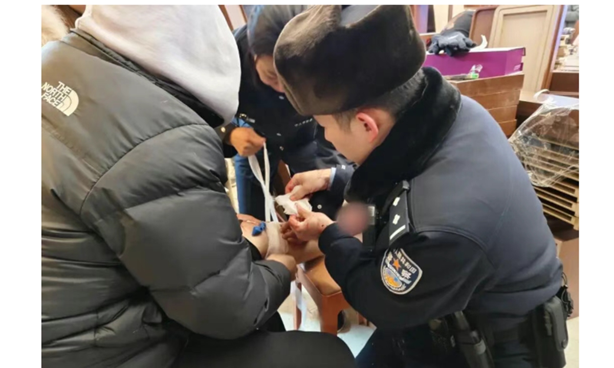 Patrolling officers on Central Street in #Harbin, capital of Northeast China's Heilongjiang Province, recently assisted a man with a ruptured varicose vein in his leg and profuse bleeding during chilly winter night, with the incident sparking discussion among netizens.