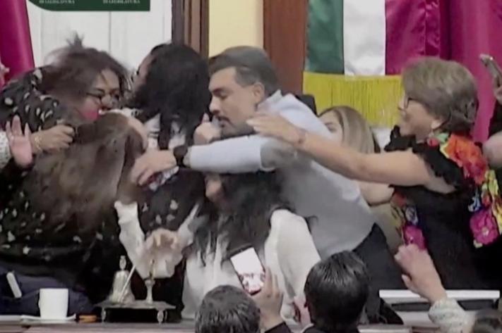 Insultes, bousculade, tirages de cheveux, coups : des députées du Parlement de l’État de Mexico se sont écharpées en pleine assemblée lundi devant les caméras de télévision qui retransmettaient la session en direct. Les esprits se sont échauffés lorsque des députées du Parti action nationale (PAN, droite) ont occupé la tribune pour protester contre un supposé non-respect d’accords de la part du parti Morena au pouvoir, classé à gauche et majoritaire dans ce Parlement local. Cinq députées des deux partis ont d’abord échangé des propos virulents avant d’en venir aux mains. Les membres de Morena cherchant à faire descendre de la tribune les opposantes du PAN qui refusaient de bouger. « Nous sommes montées à la tribune de manière pacifique, sans toucher personne, et la décision du groupe parlementaire majoritaire et ses alliés a été de tenter de récupérer la présidence de séance par la violence », a déclaré Andrés Atayde, coordinateur des députés du PAN, lors d’une conférence de presse après l’incident. D’autres députés ont tenté de séparer les protagonistes, provoquant un tumulte généralisé, tandis que le reste de l’assemblée regardait ou filmait la scè