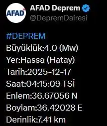 hatay’da 4.0 büyüklüğünde deprem