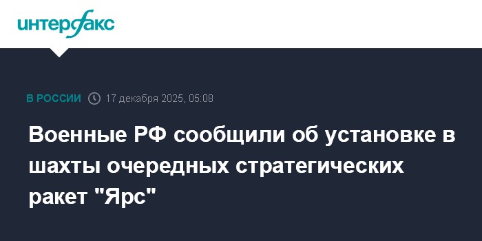 Российские военные сообщили о загрузке в шахтные пусковые установки очередных межконтинентальных баллистических ракет комплекса "Ярс"."В разных регионах страны в преддверии Дня РВСН проведена загрузка межконтинентальных баллистических ракет ракетного комплекса "Ярс" в шахтные пусковые установки", - говорится в сообщении Минобороны РФ."Перевооружение РВСН заключается не только в оснащении войск новыми ракетными комплексами, но и в создании новой инфраструктуры, обеспечивающей более качественные условия для подготовки дежурных сил, несения личным составом боевого дежурства и отдыха", - проинформировало министерство."Реализация запланированных мероприятий по перевооружению РВСН позволит повысить долю современных ракетных комплексов стратегического назначения и увеличить возможности группировки по выполнению поставленных задач", - сказано в сообщении Минобороны РФ.