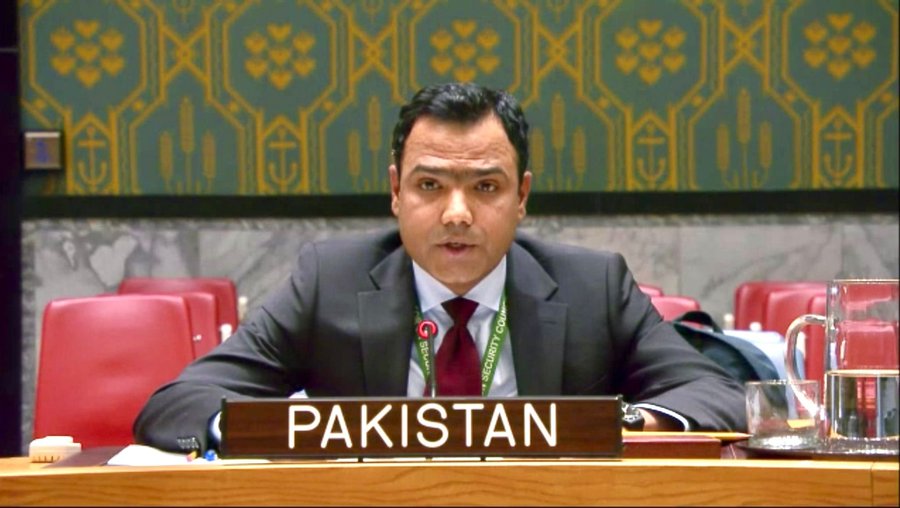 پاکستان مشن کے کونسلر اور پولیٹیکل کوآرڈینیٹر گل قیصر سروانی 16 دسمبر۔ 2025 کو اقوام متحدہ کی سلامتی کونسل میں کھلے مباحثے سے خطاب کر رہے ہیں (پاکستان مستقل مشن/ایکس)