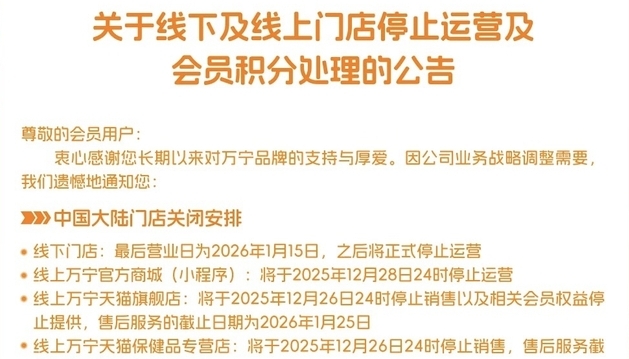 12月16日,万宁中国官网发布公告宣布,因战略调整需要,即将关闭中国大陆所有线下门店及线上商城,呼吁会员尽快处理积分。