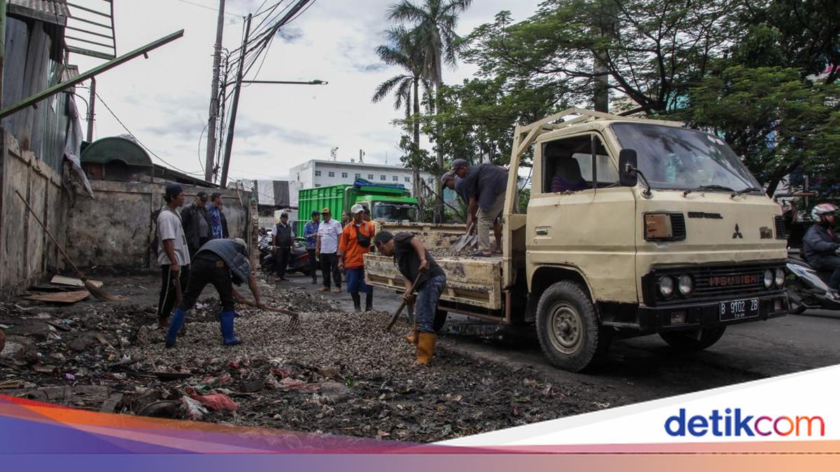 Sampah yang menggunung di Pasar Cimanggis, Ciputat, Tangsel, sudah diangkut. Pekerja kini menambal permukaan di tempat penampungan sementara (TPS).