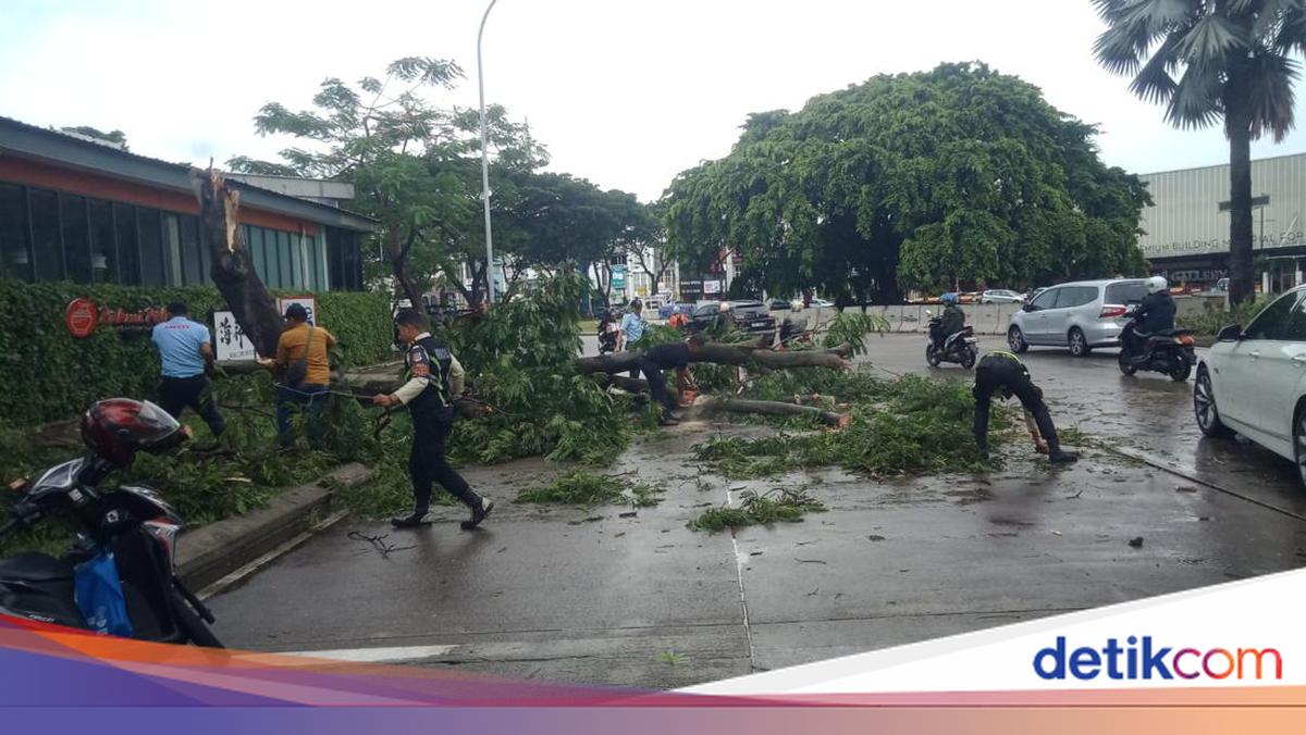 Sebuah pohon tumbang di Serpong, Tangsel, menimpa kendaraan dan memecahkan kaca. Tidak ada korban, arus lalu lintas kini berangsur normal.