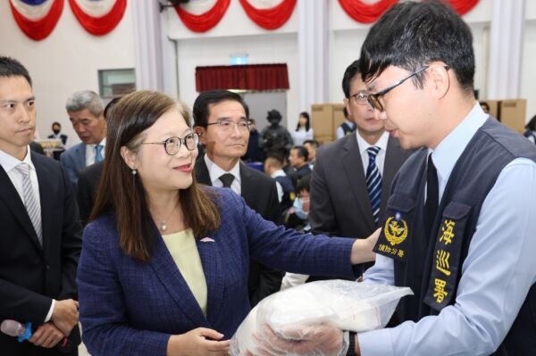海委会主委管碧玲12月17日出席海巡署“查获货柜走私及制毒工厂案联合记者会”,慰勉海巡人员。(海巡署提供)
