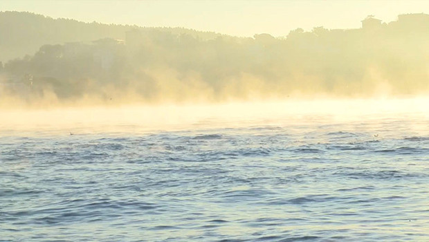 İstanbul Boğazı'nda sabah saatlerinde deniz yüzeyinden buhar yükseldi. Boğaz'dan geçen gemilerin önünde ise yunuslar görüldü.