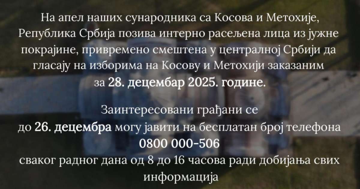 Komesarijat za izbeglice i migracije Srbije pozvao je raseljena lica sa Kosova, koja su privremeno smeštena u centralnoj Srbiji, da glasaju na izborima zakazanim za 28, decembar.