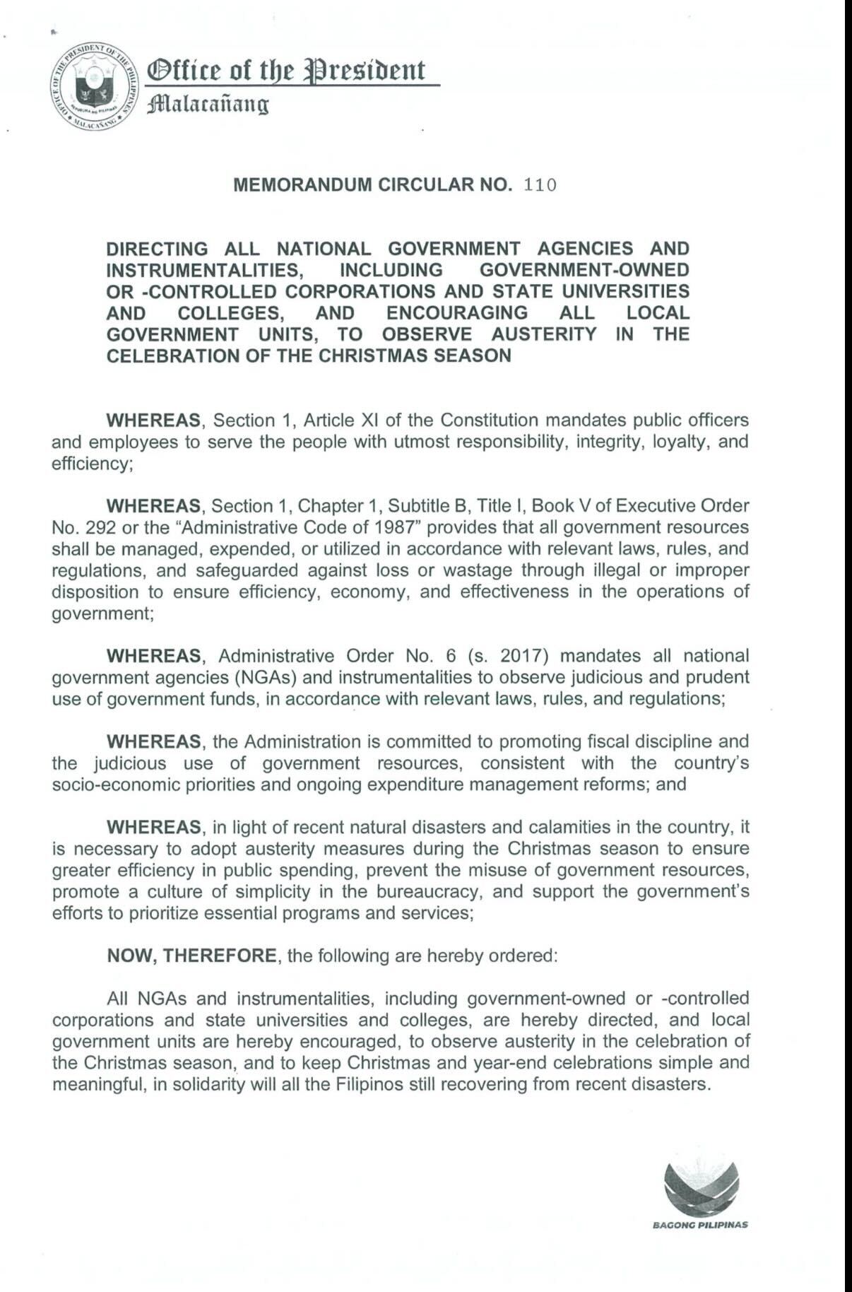 Malacañang has issued a memorandum directing all national government agencies, GOCCs, and state universities and colleges to observe austerity in their Christmas celebrations.