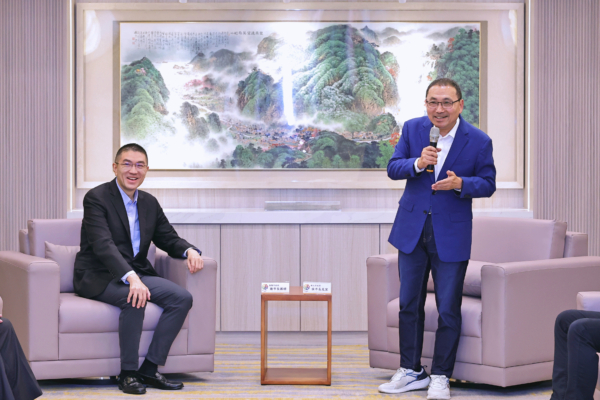 基隆市长谢国梁(左)与新北市长侯友宜(右)进行交流。(基隆市政府提供)
