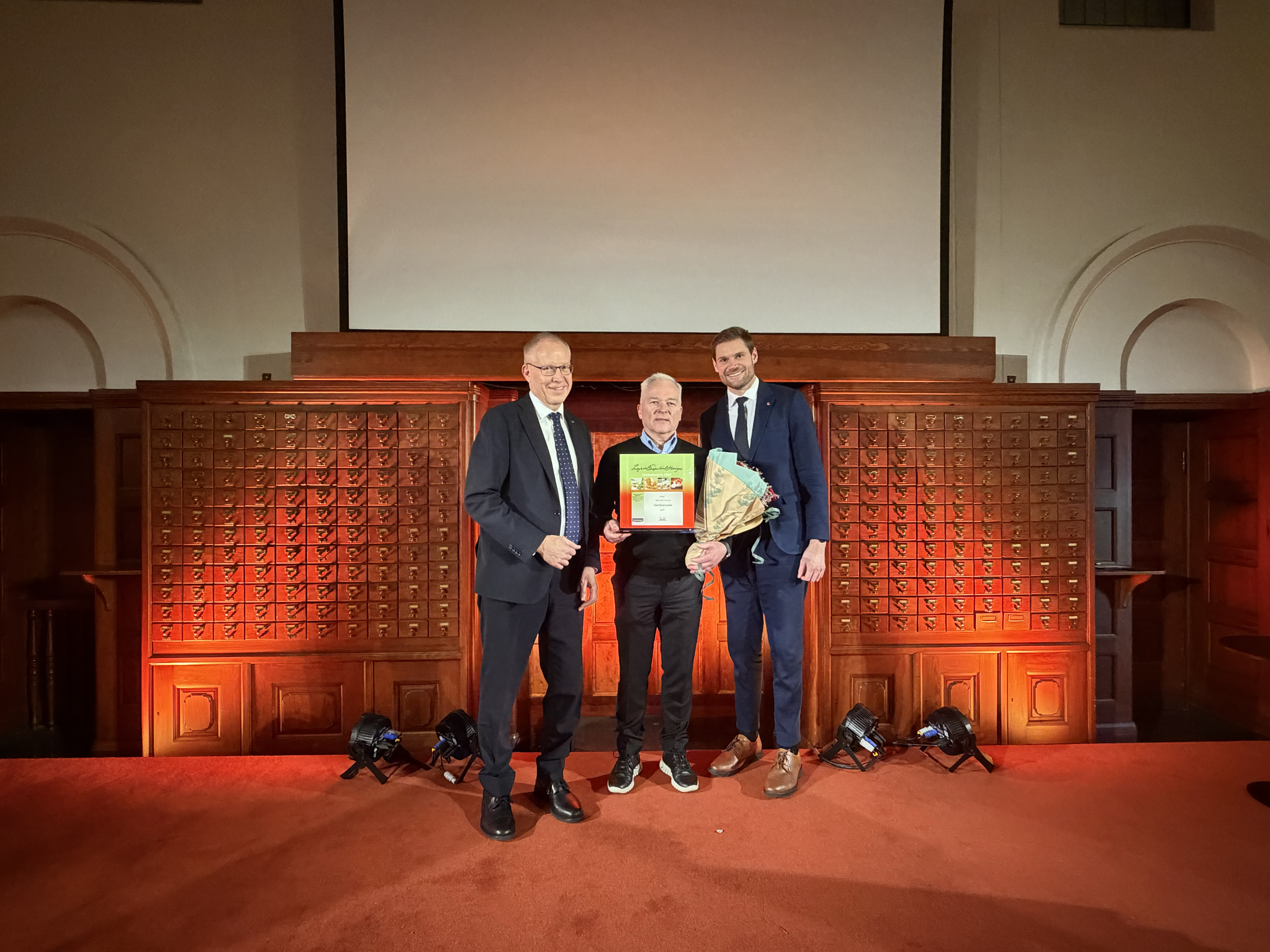 Avdelingsleder ved Strinda videregående skole i Trondheim, Geir‑Rune Larsen, vinner Ingrid Espelid Hovigs matkulturpris for sitt enestående arbeid innen rekruttering til restaurant- og matfag. Landbruks- og matminister Nils Kristen Sandtrøen delte ut prisen på Nasjonalbilioteket i Oslo.
