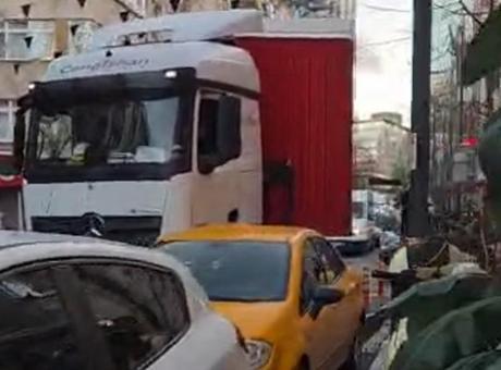 Kağıthane’de İzmir’den geldiği öğrenilen ve mahalledeki dar sokakta ilerleyen TIR caddeye dönmek istedi. Bu sırada şoför park halindeki 3 araca zarar verdi. Dakikalarca dönmek için manevra yapan şoför, trafiğin de durmasına neden oldu. TIR'ın park halindeki araçlara zarar verdiğini gören çevredeki bir kadının "Abi linç edileceksin birazdan, burası Gültepe, kimin arabası olduğunu bilmiyorsun" diyerek duruma tepki gösterdiği görüldü. Başka bir kadının ise, "Bütün araçların içinden geçti delirmiş" dediği duyuldu. Olay anı cep telefonu kamerasına yansıdı. TIR DAR SOKAKTA MAHSUR KALDI, ARAÇLAR HASAR GÖRDÜ Olay, dün saat 08.30 sıralarında Ortabayır Mahallesi’nde meydana geldi. Edinilen bilgiye göre İzmir’den geldiği öğrenilen 35 EC 122 plakalı TIR’ın şoförü, semtteki dar sokağa girdi. Burada ilerleyen şoför ardından caddeye bağlanmak için manevra yapmaya başladı. Bu sırada TIR’ın dorsesi park halinde olan 34 MRK 491 plakalı araca çarptı. Vatandaşların bağırarak uyarmasına rağmen manevra yapmaya devam eden şoför, bu kez de 34 AC 5353 plakalı otomobile çarparak zarar verdi. İşlek caddede uzun süre trafiğin durmasına neden olan TIR şoförü, manevra yapmayı sürdürerek park halindeki başka bir otomobile daha çarptı. 'LİNÇ EDİLECEKSİN BURASI GÜLTEPE' Çevredeki vatandaşların kaçmaya çalıştığını düşündüğü TIR şoförü, birkaç manevra daha yaptıktan sonra durdu. Bu sırada yoldan geçen bir kadın, "Abi linç edileceksin birazdan, burası Gültepe, kimin arabası olduğunu bilmiyorsun" diyerek duruma tepki gösterdi. Bir başka vatandaş ise, "Bütün araçların içinden geçti delirmiş" dediği duyuldu. Araç sahiplerinin olay yerine gelmesi sonrası sürücülerin kendi arasında trafik kazası raporu tuttuğu öğrenildi.