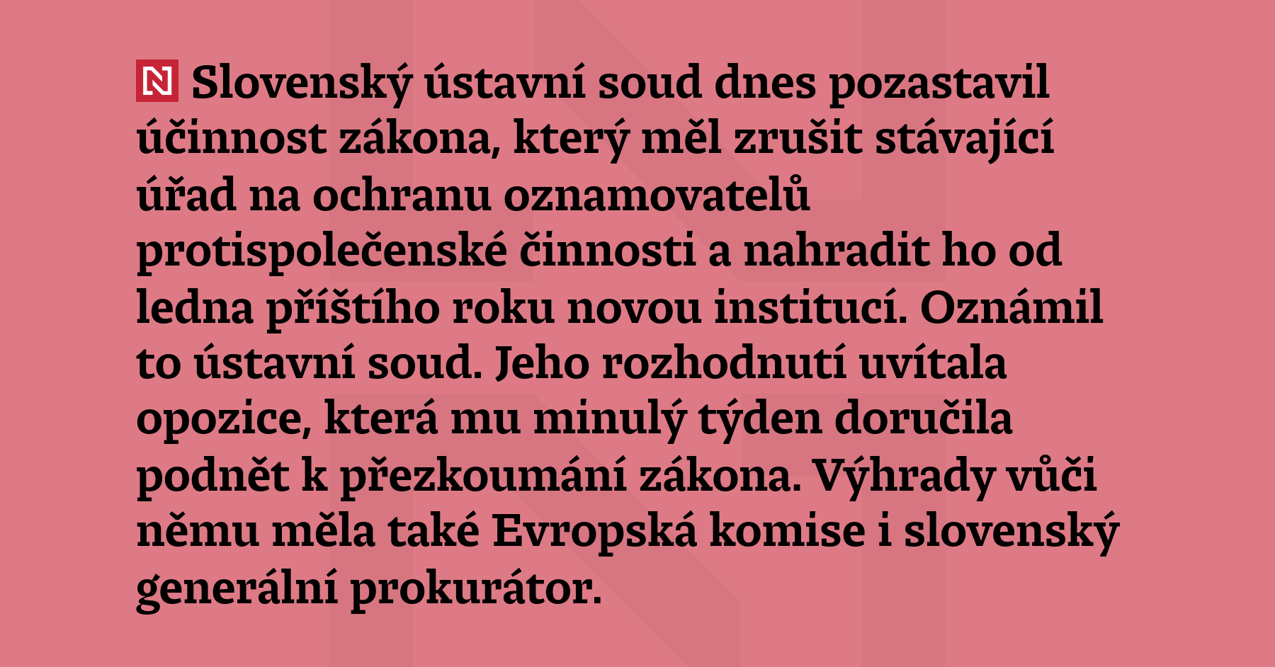 Slovenský ústavní soud pozastavil účinnost zákona, který měl zrušit stávající úřad na ochranu oznamovatelů protispolečenské činnosti a nahradit ho od ledna příštího roku novou institucí. Oznámil to ústavní soud. Jeho rozhodnutí uvítala opozice, která mu minulý týden doručila podnět k přezkoumání zákona. Výhrady vůči němu měla také Evropská komise i slovenský generální prokurátor. (ČTK)