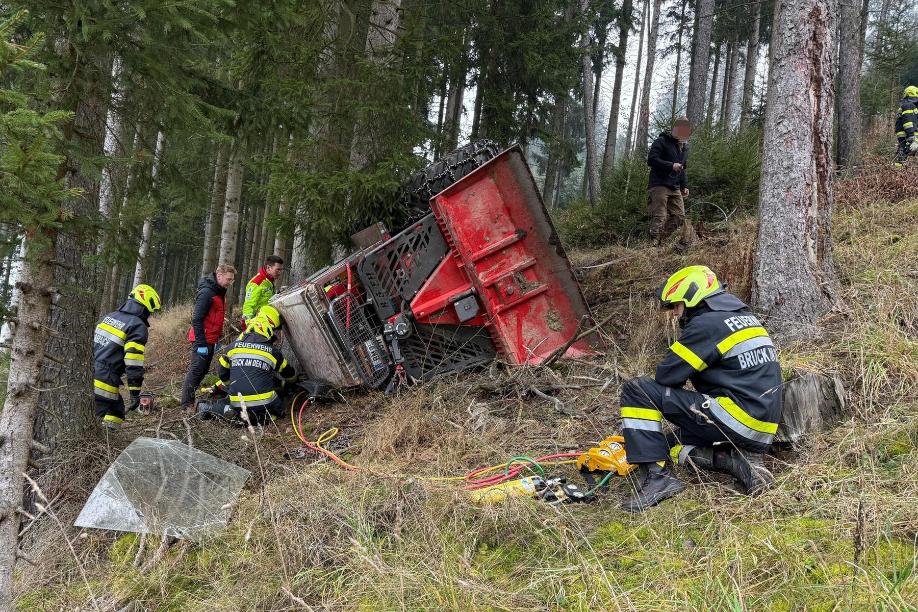 400 Meter mussten die Einsatzkräfte zu Fuß zur Unfallstelle, um verletzte Person mittels Greifzug und Hebekissen zu befreien. Bei der Bergung war schließlich ein zweiter Traktor.
