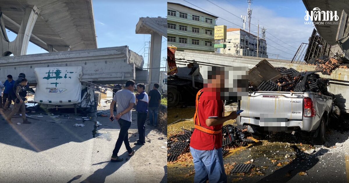 ด่วน! รถบรรทุกเสียหลัก ดัมพ์ฟาดสะพานลอยถล่ม ทับหัวรถ-กระบะขนไข่ เจ็บ 3 ราย
