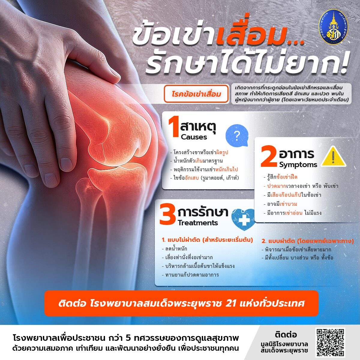 โรคข้อเข่าเสื่อม ที่พบในผู้สูงอายุและผู้มีน้ำหนักมาก ส่งผลให้เดินลำบาก ขึ้นบันไดเจ็บ เข่าติดขัด สามารถรักษาได้ แบบไม่ผ่าตัด (สำหรับระยะเริ่มต้น) แบบผ่าตัด (โดยแพทย์เฉพาะทาง) โรงพยาบาลสมเด็จพระยุพราช 21 แห่งทั่วประเทศ ให้บริการด้วยแพทย์ที่มีความเชี่ยวชาญ เพื่อประชาชนทุกคน มูลนิธิโรงพยาบาลสมเด็จพระยุพราช โดยการสนับสนุนจาก สำนักงาน กสทช. ร่วมยกระดับการให้บริการสาธารณสุขแก่ประชาชน สนใจหาข้อมูลเพิ่มเติม https://www.facebook.com/FoundationForTheCrownPrinceHospita https://www.youtube.com/@crownprincehospital7530 #มูลนิธิโรงพยาบาลสมเด็จพระยุพราช #รักษาข้อเข่า #ศัลยกรรมกระดูก #CrownPrinceHospital #รพร.21แห่งทั่วประเทศ