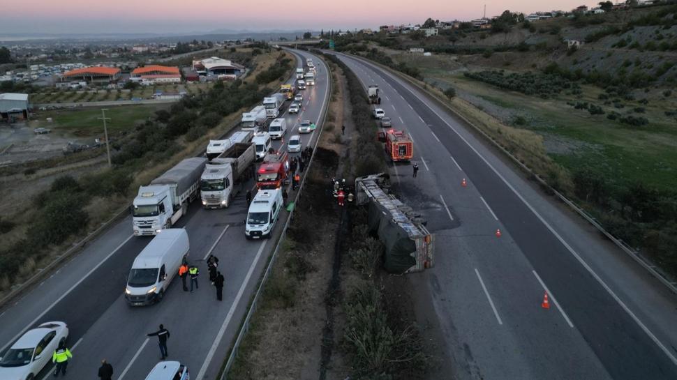 Hatay'ın Dörtyol ilçesinde refüje çarpan tır devrildi. Kaza sonrası çıkan yangında araçta bulunan 2 kişi hayatını kaybetti.