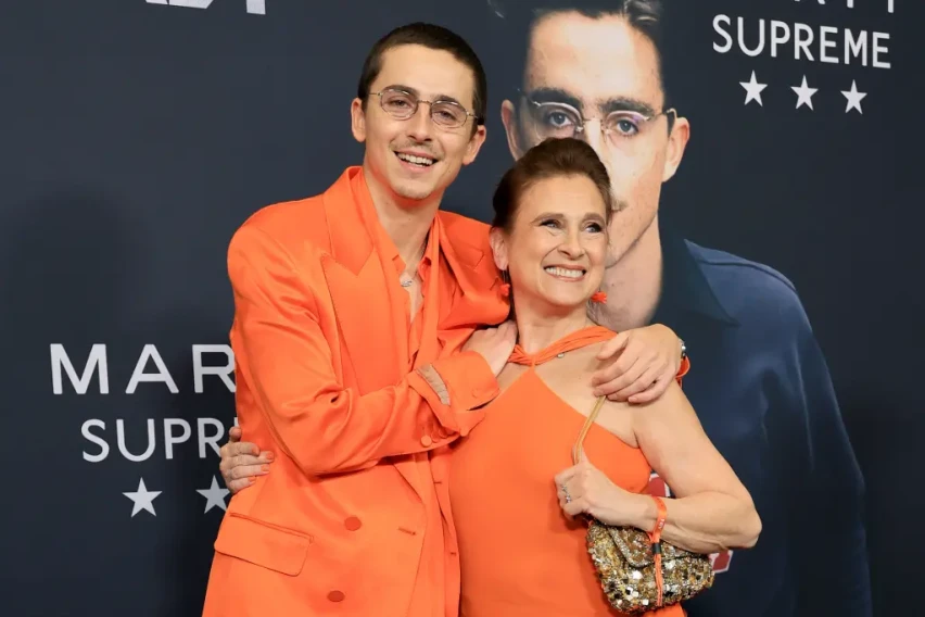 На премиерата на својот нов филм „Marty Supreme“ во Њујорк, Тимоти Шаламе се појавил облечен во портокалова модна комбинација, а бил модно усогласен со својата мајка Никол Флендер.