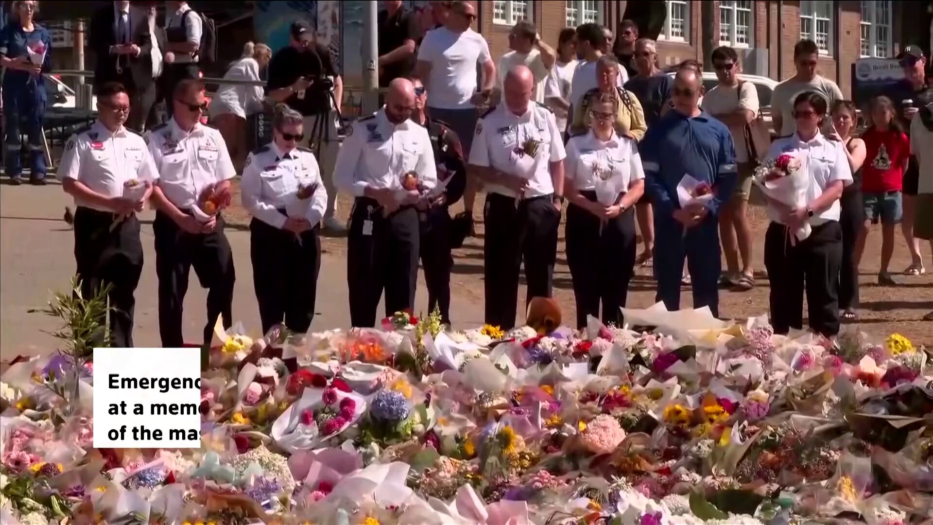 Emergency service workers laid flowers and embraced colleagues at a memorial in Sydney's Bondi area, paying tribute to victims of the mass shooting spree in Sydney