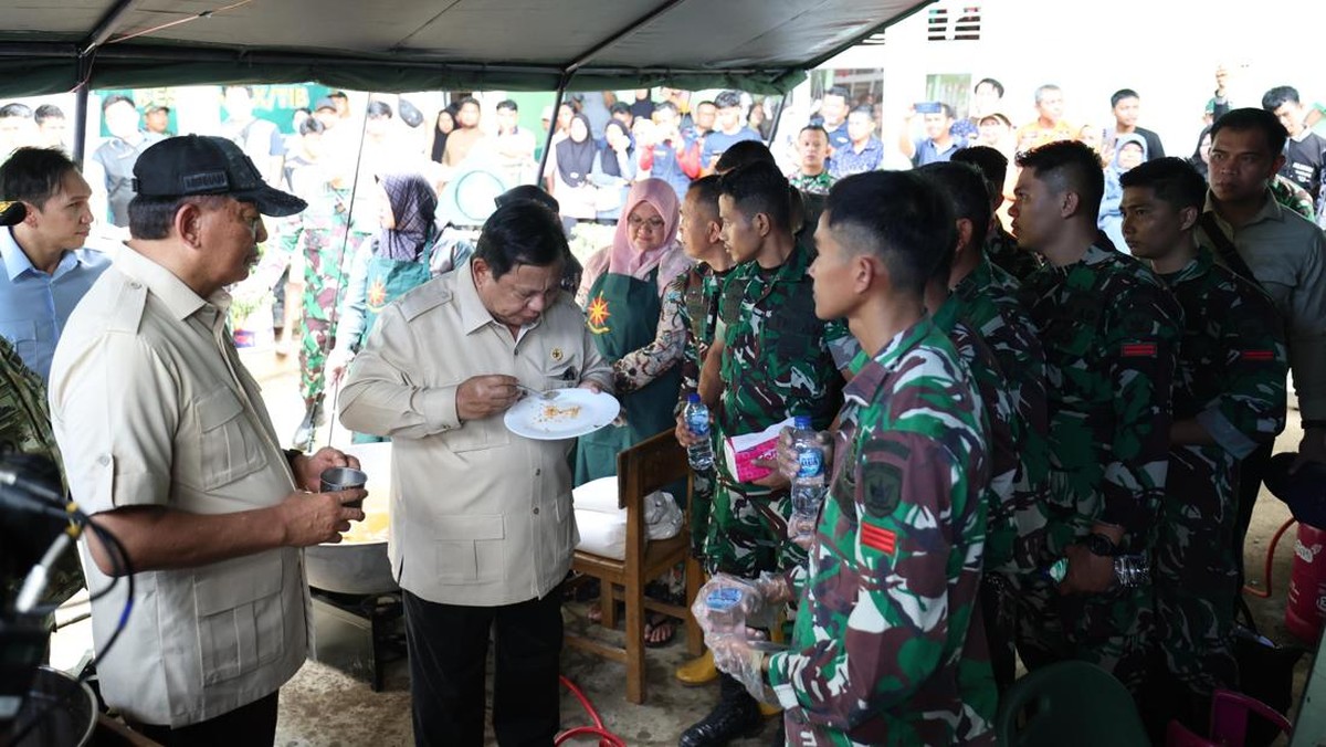 Presiden RI Prabowo Subianto menyantap nasi goreng telur ceplok yang jadi menu makan warga di posko pengungsian, Kabupaten Agam, Sumbar, Kamis (15/12/2025).