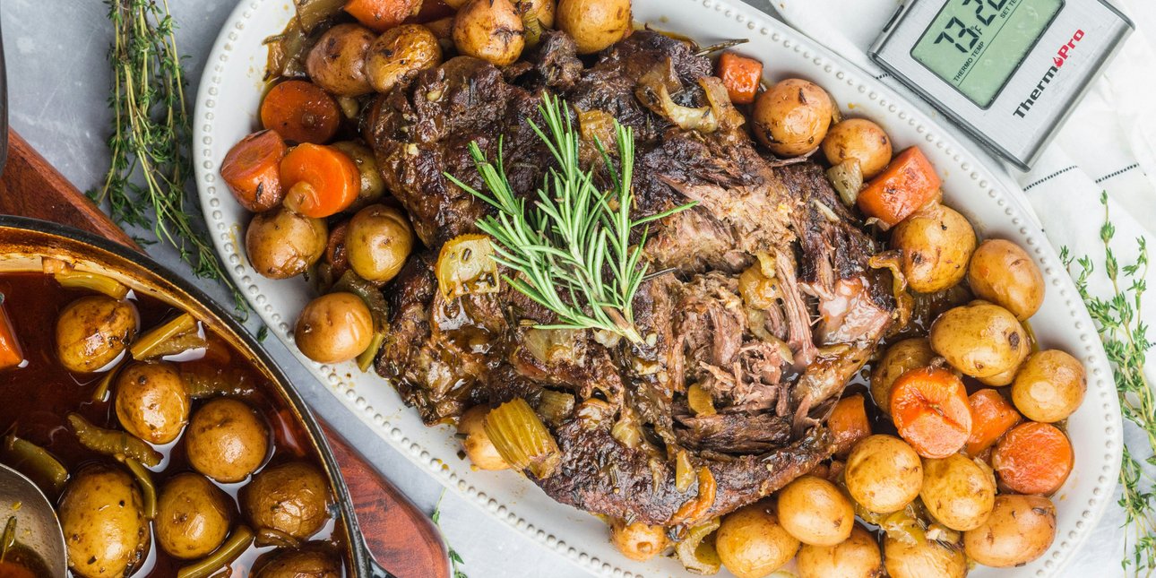 Το αγαπημένο μας μοσχάρι σιγοψήνεται στον φούρνο και πρωταγωνιστεί στα γεύματα των γιορτών. Τα γιορτινά γεύματα των ημερών είναι ταυτισμένα εν πολλοίς με το χοιρινό και τη γαλοπούλα . Αυτό όμως δε σημαίνει ότι δεν μπορούμε να μαγειρέψουμε κάποιο άλλο κρέας είτε για να πρωταγωνιστήσει στα τραπέζια μας είτε για να προσφέρουμε περισσότερες επιλογές στους καλεσμένους μας. Ένα ολόκληρο κομμάτι μοσχαρίσιου κρέατος είναι μια πρόταση που ξεφεύγει λίγο από τα καθιερωμένα αλλά παραμένει στο κλίμα επισημότητας ενός εορταστικού καλέσματος. Και φυσικά κρατάει επάξια τα σκήπτρα της νοστιμιάς αφού το σιγοψημένο μοσχάρι που λιώνει στο στόμα ξετρελαίνει πάντα μικρούς και μεγάλους, ειδικά αν συνοδεύεται από πατατούλες baby που έχουν μελώσει μέσα σε σάλτσα κρασιού. Κι αν σκέφτεστε ότι το μοσχάρι είναι ένα κρέας που μπορεί να βγει σκληρό ή θέλει παίδεμα για να γίνει όπως πρέπει, ένα τρυφερό κομμάτι (π.χ. χτένι ή ελιά) και μια ωραία γιορτινή συνταγή αρκούν για να αναθεωρήσετε. Ακολουθήστε τη συνταγή που σας προτείνουμε και θα διαπιστώσετε ότι θα φτιάξετε αυτό το απολασυτικό φαγητό πιο εύκολα και γρήγορα από τη γαλοπούλα και το χοιρινό. Μοσχάρι με baby πατάτες στον φούρνο Υλικά για 6-8 μερίδες 1.500 γρ. μοσχάρι (σπάλα, χτένι ή ελιά), ολόκληρο κομμάτι 1/2 φλ. ε.π. ελαιόλαδο 2 κ.σ. αγελαδινό βούτυρο 1 κιλό πατάτες baby, ολόκληρες με φλούδα, πλυμένες καλά 3 μεγάλα καρότα, χοντροκομμένα 2 μεγάλα κλωνάρια σέλερι, χοντροκομμένα 1 μεγάλο ξερό κρεμμύδι, χοντροκομμένες 2 σκελίδες σκόρδο, ολόκληρες, καθαρισμένες 1 ποτήρι κρασιού κόκκινο ξηρό κρασί (κατά προτίμηση Pinot noir) 2 ποτήρια ζωμό κρέατος ή λαχανικών, σπιτικό η ψυγείου 1 κλωνάρι δενδρολίβανο αλάτι φρεσκοτριμμένο πιπέρι χυμός από ένα λεμόνι Εκτέλεση Σε μια βαθιά κατσαρόλα ζεσταίνουμε το ελαιόλαδο και το βούτυρο σε μέτρια φωτιά και σοτάρουμε το κρέας από όλες τις πλευρές για 5-7 λεπτά μέχρι να πάρει χρώμα . Το μεταφέρουμε σε ένα βαθύ ταψί ή γάστρα. Ρίχνουμε στην κατσαρόλα τις πατάτες και τις σοτάρουμε κι αυτές για 4-5 λεπτά. Τις βάζουμε και αυτές στο ταψί γύρω από το κρέας και συνεχίζουμε το σοτάρισμα με τα καρότα, το σέλερι, το κρεμμύδι και το σκόρδο για 3-4 λεπτά. Σβήνουμε με το κρασί και αφήνουμε μισό λεπτό να εξατμιστεί το αλκοόλ. Προσθέτουμε τον ζωμό, το δενδρολίβανο και μπόλικο αλατοπίπερο. Μόλις πάρουν μια βράση τα ρίχνουμε και αυτά στο ταψί. Προθερμαίνουμε τον φούρνο στους 180°C στον αέρα και σκεπάζουμε το ταψί με λαδόκολλα και αλουμινόχαρτο κλείνοντας καλά γύρω γύρω. Αν χρησιμοποιούμε γάστρα, σκεπάζουμε με το καπάκι. Ψήνουμε για 1,5 ώρα μέχρι να μαλακώσουν το κρέας και οι πατάτες. Αφαιρούμε τη λαδόκολλα και το αλουμινόχαρτο (ή το καπάκι της γάστρας) και ψήνουμε για μισή ώρα ακόμα μέχρι να ροδίσει καλά το κρέας και να εξατμιστούν τα περιττά υγρά του ταψιού ώστε να μείνει με το ελαιόλαδο και τη σάλτσα του. Σερβίρουμε ζεστό. Tip Για να διαπιστώσετε αν έχει ψηθεί το κρέας δοκιμάστε το, κόβοντάς το σε ένα χοντρό σημείο. Το ζητούμενο είναι να παραμείνει μαλακό και ζουμερό χωρίς να στεγνώσει γι αυτό σας προτείνουμε να πάρετε σπάλα, χτένι ή ελιά που είναι κομμάτια με λίπος και κολλαγόνο. Χοντρικά υπολογίστε 1 ώρα ψήσιμο ανά κιλό κρέατος. Ωστόσο, για να ασφαλές και απόλυτα ακριβές αποτέλεσμα χρησιμοποιήστε θερμόμετρο . Διαβάστε περισσότερα στο iefimerida.gr