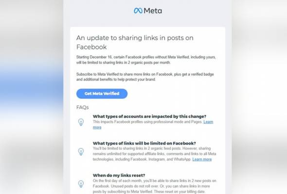Meta menjelaskan ciri ini masih dalam peringkat ujian bagi mengumpul maklum balas mengenai bayaran untuk memuat naik pautan.