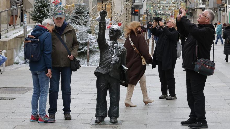 Han sido tantos los ataques que ha sufrido la estatua de Manuel Castro en la calle Príncipe que cuesta recordarlos. Más de quince en los últimos años. El último, recientemente. Como se puede ver en la imagen que ilustra esta información, algún viandante ha arrojado un material blanco que simula la nieve -posiblemente, procedente de los jardines navideños ubicados frente al Marco- sobre la efigie del icónico vendedor de periódicos de FARO DE VIGO.