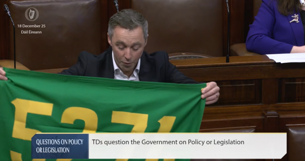 Social Democrats TD Rory Hearne held up a flag emblazoned with the number of children spending Christmas in homelessness.