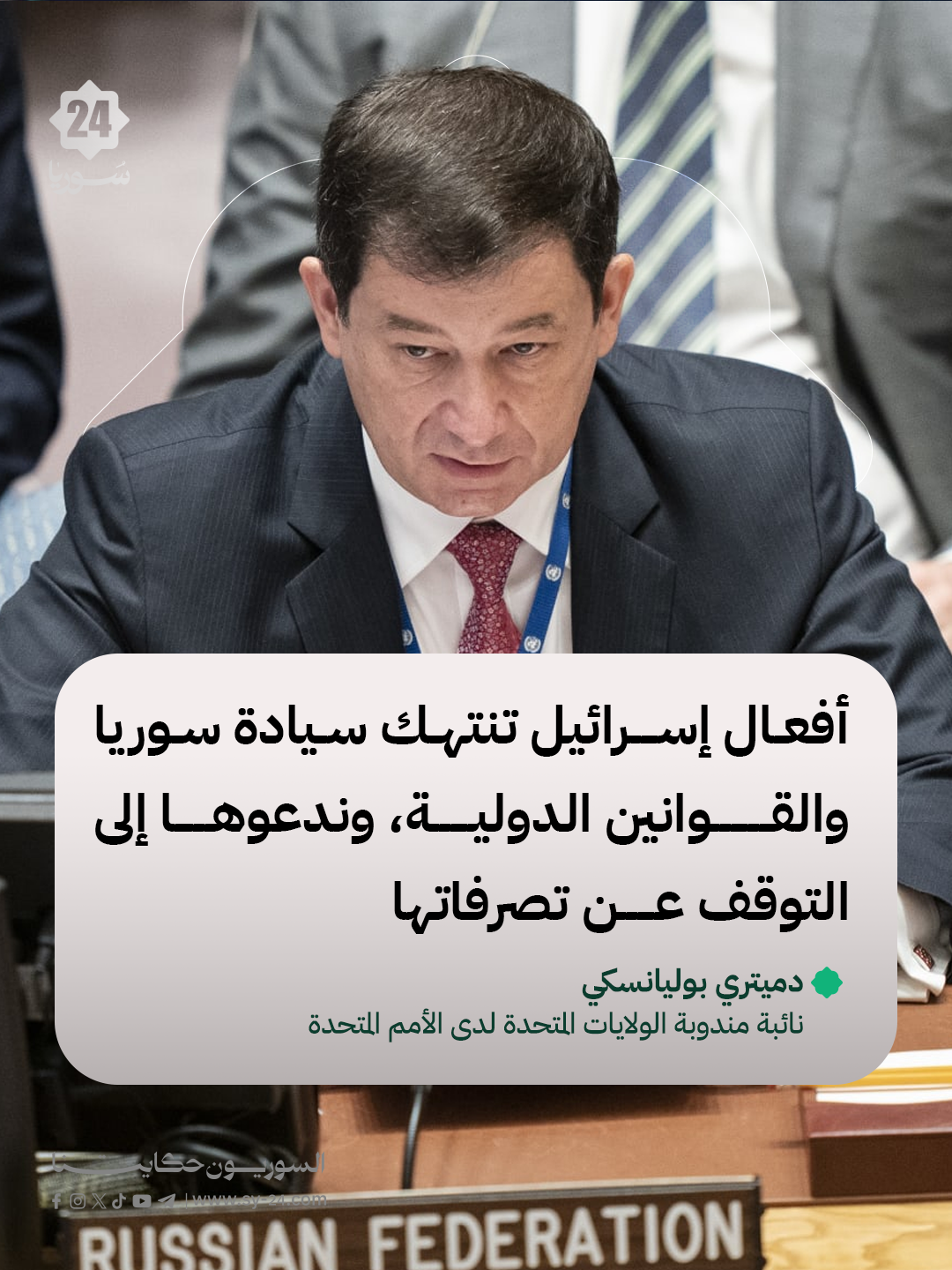 نائب مندوب روسيا لدى الأمم المتحدة دميتري بوليانسكي: زيارة وفد مجلس الأمن إلى سوريا تعكس احترام المجلس لسيادة سوريا واستقلالها ووحدة أراضيها. الحفاظ على سوريا دولة موحدة يتطلب استمرار الحوار الفعّال بين جميع الأطياف. أفعال إسرائيل تنتهك سيادة سوريا والقوانين الدولية، وندعوها إلى التوقف عن تصرفاتها. على إسرائيل تنفيذ التزاماتها وفق قرار فض الاشتباك لعام […] The post نائب مندوب روسيا لدى الأمم المتحدة دميتري بوليانسكي: appeared first on SY24 .
