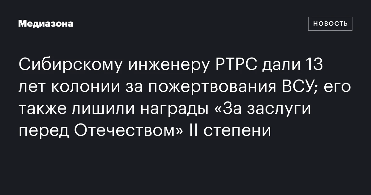 Сибирскому инженеру РТРС дали 13 лет колонии за пожертвования ВСУ; его также лишили награды «За заслуги перед Отечеством» II степени