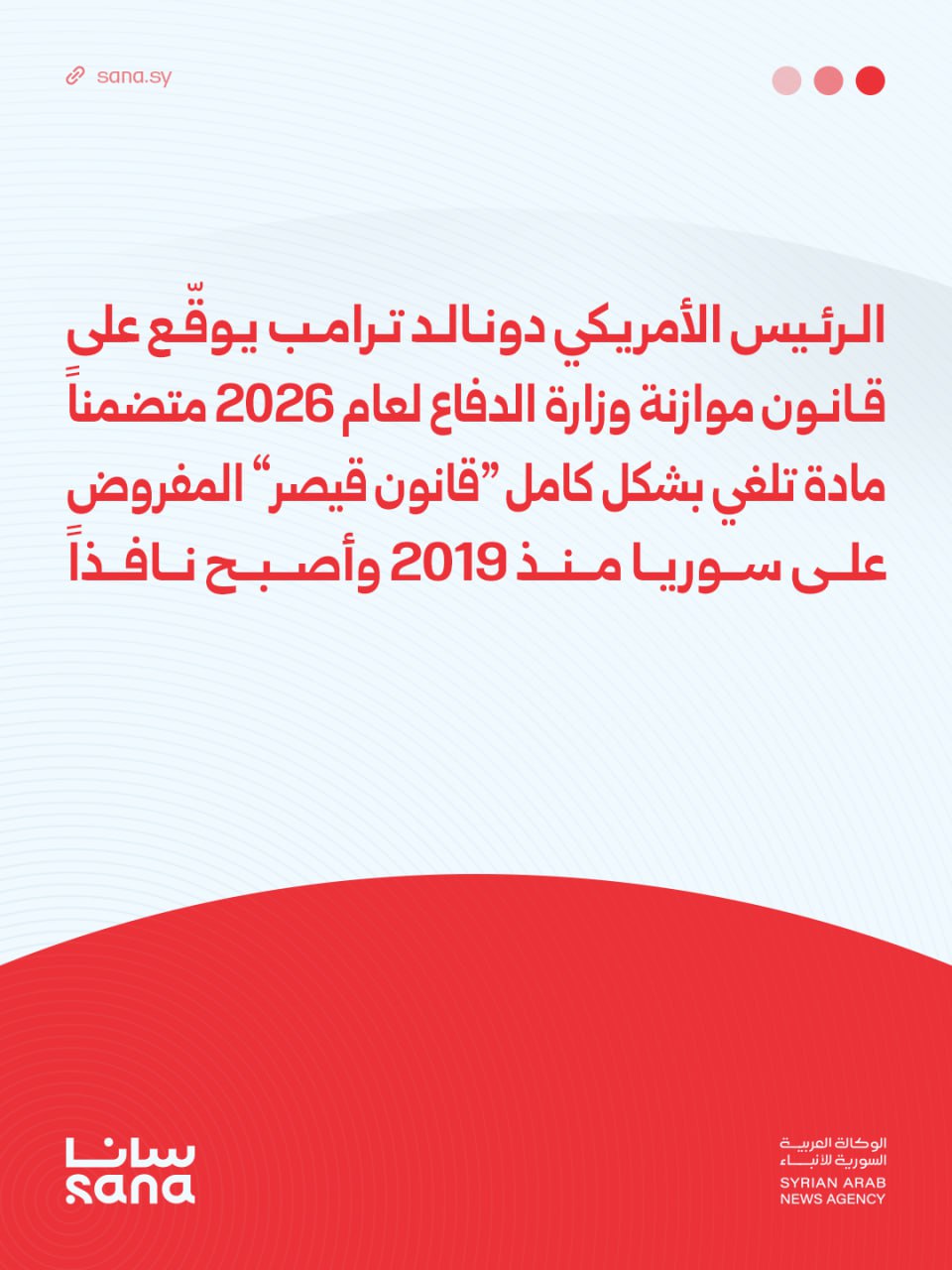 الرئيس الأمريكي دونالد ترامب يوقّع على قانون موازنة وزارة الدفاع لعام 2026، متضمناً مادة تلغي بشكل كامل "قانون قيصر" المفروض على سوريا منذ 2019 وأصبح نافذاً.