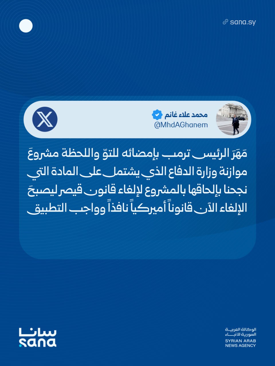 بتوقيع الرئيس ترامب على قانون موازنة وزارة الدفاع الذي يتضمن المادة التي نجحنا بإلحاقها بالمشروع لإلغاء قانون قيصر، أصبحَ الإلغاءُ الآن قانوناً أمريكياً نافذاً وواجب التطبيق.