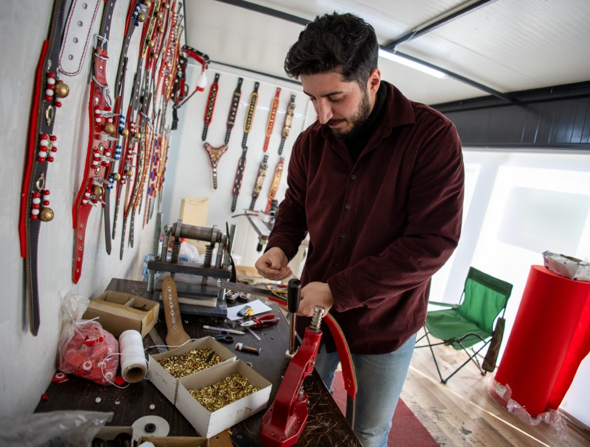 6 Şubat 2023'teki depremlerde iş yeri yıkılan esnaf, konteynerde kurduğu atölyede hazırladığı köpek tasmalarını 20'den fazla ülkeye ihraç ediyor.