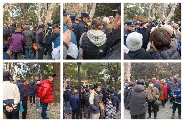 2025年12月17日,上海信访办访民日,许多访民在人民公园举牌喊冤,引来数十名警察阻止抓人。(受访者提供/大纪元合成)