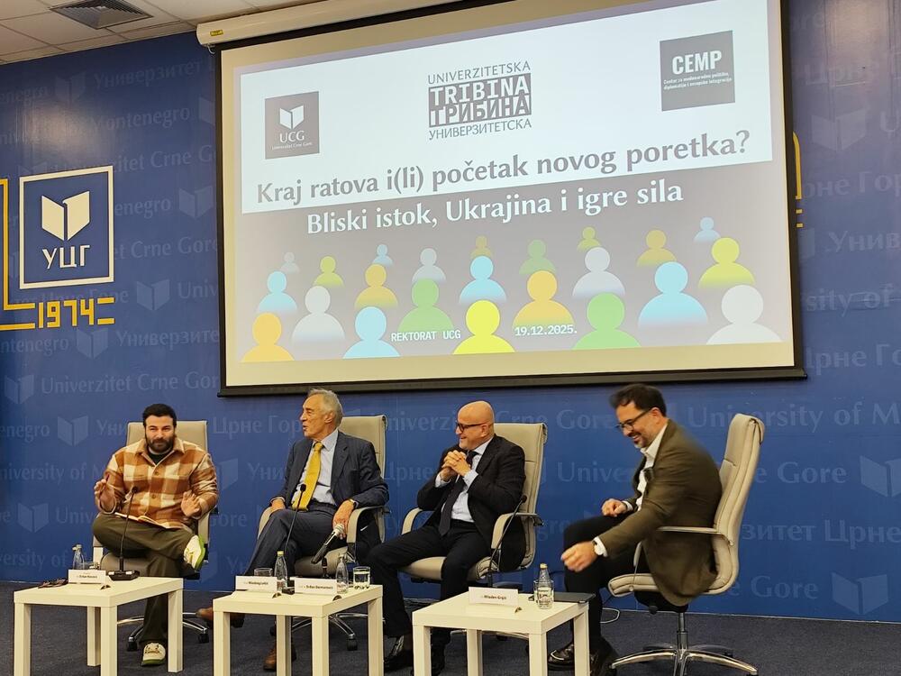 Tribinu "Kraj ratova i(li) početak novog poretka? Bliski istok, Ukrajina i igre sila", organizovao je Univerzitet Crne Gore (UCG), u saradnji sa Centrom za međunarodnu politiku, diplomatiju i evropske integracije