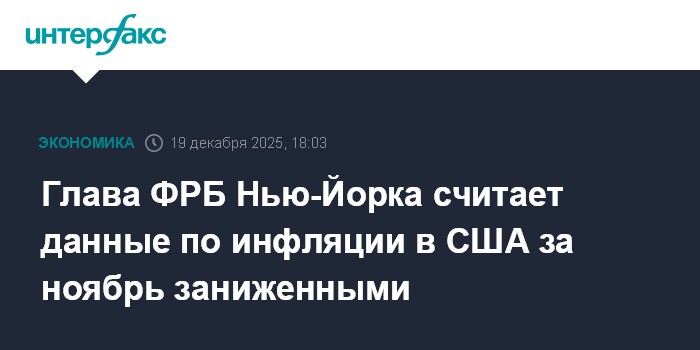 Ноябрьские данные по инфляции в США были искажены техническими факторами и в результате оказались ниже, чем должны быть, сказал CNBC президент Федерального резервного банка Нью-Йорка Джон Уильямс."Были некоторые особые факторы и практические моменты, связанные с невозможностью сбора данных в октябре и первой половине ноября, - считает он. - Думаю, что из-за этого показатели по некоторым категориям были искажены, что привело к занижению индекса CPI, вероятно, на одну десятую".