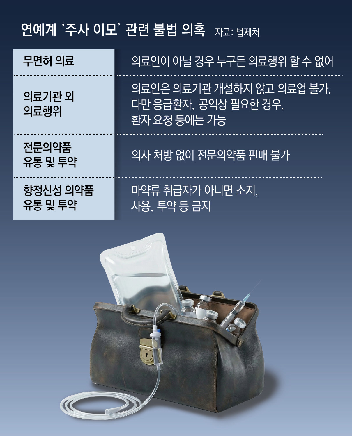 《연예계 ‘주사이모’ 논란 일파만파연예계 ‘주사 이모’ 논란이 일파만파 번지고 있다. 주사 이모는 병원이 아닌 공간에서 수액, 진통제, 항생제 등 의약품을 불법적으로 주사하는 이들을 말한다. 개그우먼 박나래 씨에 이어 아이돌 그룹 멤버, 유명 유튜버까지 불법 방문 진료를 받은 사실을 인정하고 방송 활동을 중단했다. 무면허 의료 행위뿐만 아니라 의사가 처방하지 않으면 쓸 수 없는 향정신성의약품을 제공받았다는 의혹도 제기됐다. 간단한 영양 수액주사도 의사의 처방을 받지 않고 맞을 경우 감염, 쇼크, 장기 부담 등 부작용이 생길 수 있다.》개그우먼 박나래 씨를 둘러싼 불법 의료행위 논란이 연예계 전반으로 확산되고 있다. 박 씨와 같은 프로그램에 출연 중인 유명 유튜버 입짧은햇님(본명 김미경)도 19일 이른바 ‘주사이모’로 불리는 여성 이모 씨로부터 방문 진료를 받은 사실을 인정하며 활동 중단을 선언했다. 전문가들은 이 같은 무면허 의료행위가 마약류 의약품 중독을 초래하거나, 기저질환이