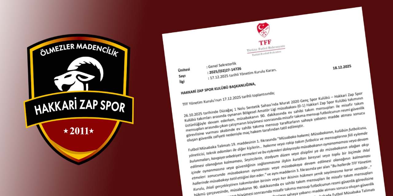 Türkiye Futbol Federasyonu, Hakkari Zap Spor Kulübü ile Murat 2020 Genç Spor Kulübü arasında oynanan Bölgesel Amatör Lig karşılaşmasına ilişkin her iki takımın da hükmen yenik sayılmasına karar verdi.