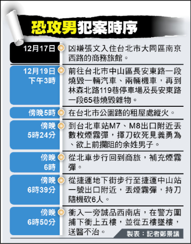 〔記者劉慶侯、鄭景議、謝武雄、周敏鴻、徐聖倫/綜合報導〕涉嫌犯下台北捷運北車、中山站恐怖攻擊事件的男子張文,經警方專案小組追查,張男不僅提早在台北市兩處租屋,形成AB點可隨時移動和藏放煙霧彈和汽油彈,且在他昨日連續縱火未引起警方注意後,進而犯下恐攻事件,意圖震驚全國,至於是何種仇恨值讓他如此瘋狂,警…