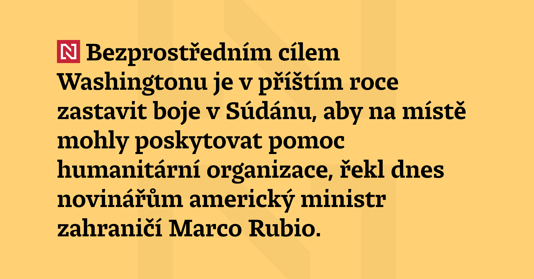 Bezprostředním cílem Washingtonu je v příštím roce zastavit boje v Súdánu, aby na místě mohly poskytovat pomoc humanitární organizace, řekl dnes novinářům americký ministr zahraničí Marco Rubio. USA podle něj jednají se všemi zúčastněnými stranami. (Reuters)