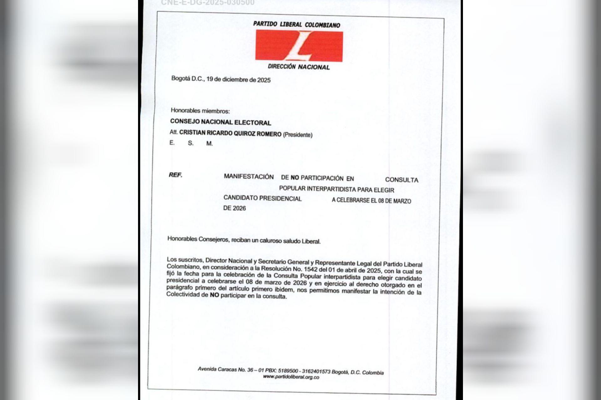 De cara a las consultas del mes de marzo que se pueden llevar a cabo de cara a la primera vuelta presidencial, varios candidatos y movimientos buscarán medir fuerzas mediante consultas, sin embargo, ya hay otros partidos que desestimaron este mecanismo. A pocos días de confirmar o desistir del deseo de participar en una consulta, tres partidos de los cuales días atrás habían manifestado su deseo de adherirse a este mecanismo, rectificaron su decisión ante el Consejo Nacional Electoral . Lea también: Se rajaron los candidatos que buscaban avalar su candidatura con firmas: de 91 comités, solo 22 entregaron las rúbricas El primer partido que ya confirmó que no estará en una consulta interpartidista es el Partido Liberal , quien le envió una comunicación al órgano electoral dejando claro que ya no participará de las consultas interpartidistas. Cabe mencionar que aunque el Liberal no iría a una consulta interpartidista, días atrás le habría ofrecido su aval al precandidato lanzado por firmas, el exministro Daniel Palacios, quien aterrizó en La Gran Consulta de la centro-derecha donde hay candidatos como David Luna, Aníbal Gaviria, Juan Daniel Oviedo y Vicky Dávila. El otro movimiento que ya presentó su declinación a las consultas interpartidistas fue Cambio Radical , quien comunicó que pese a que habían decidido inicialmente estar en una consulta interpartidista, “tras un análisis interno” decidieron retractarse, por lo que definirán su candidato mediante un proceso interno. El Partido Conservador también declinó su decisión de no estar en una consulta interpartidista, así lo habría confirmado su director, Efraín Cepeda, a medios nacionales. Esta colectividad buscará acuerdos para elegir a su figura de cara a las elecciones presidenciales. El Conservador no descarta someterse a una encuesta para una toma de decisiones sobre un candidato para los comicios de mayo. Los candidatos y partidos tienen hasta el lunes, 22 de diciembre, para retractarse sobre su decisión de participar o no de las consultas para elegir candidato a la Presidencia. Abelardo de la Espriella y Sergio Fajardo han sido los únicos que han dejado clara su intención de no participar en ninguna consulta , buscando llegar de forma directa a la primera vuelta presidencial. Por el momento y a están confirmados los movimientos de la centro-derecha con La Gran Consulta y la izquierda con el Frente Amplio. Aún se espera por la decisión del Partido de la U, quien podría declinar su participación, y el Centro Democrático, quien aunque ya eligió a Paloma Valencia como su candidata, no descarta alianzas con otros candidatos o partidos para ser una opción fuerte como oposición al actual gobierno. Siga leyendo: “La verdadera primera vuelta será la consulta en marzo”: Paloma Valencia sobre alianzas