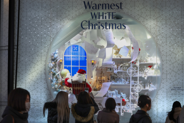圣诞节虽然是西方节日,但在亚洲已成为热闹繁忙的购物季。图为2025年12月18日,日本大阪行人欣赏橱窗里的圣诞装饰。(Buddhika Weerasinghe/Getty Images)
