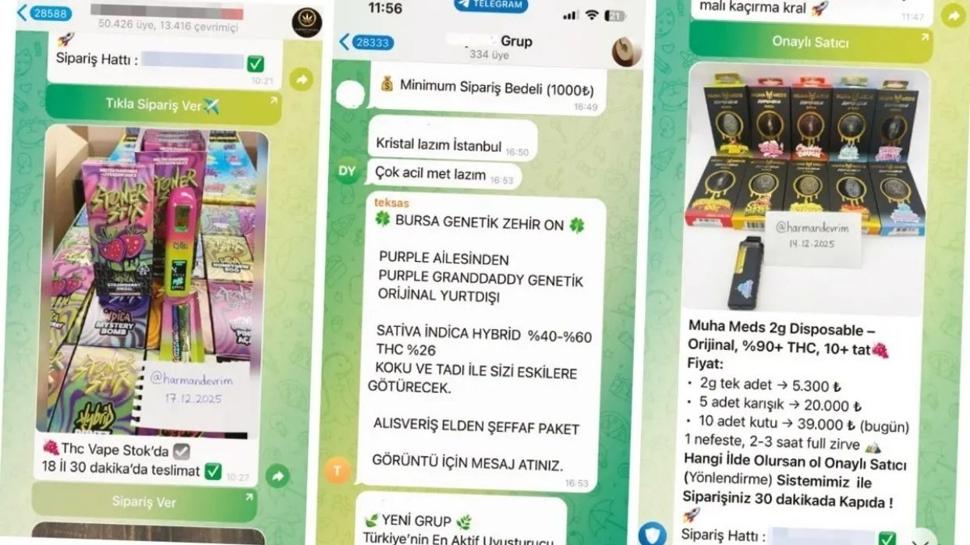 Ünlülere yönelik soruşturmayla gündeme gelen sıvı uyuşturucu THC'nin internette satıldığı ortaya çıktı. Telegram'da elektronik sigara cihazlarıyla tüketilen zehir likitlerine ait onlarca ilan olduğu görüldü.